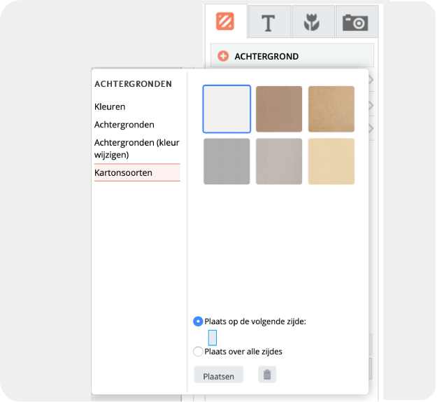 Je kiest je gewenste kartonsoort bij Achtergrond in de editor zodat wij weten welk karton je wilt. Je kunt kiezen uit wit, kraft grijs, kraft naturel of kraft bruin. In het winkelmandje kies je vervolgens voor het papiersoort Karton 530 gram.