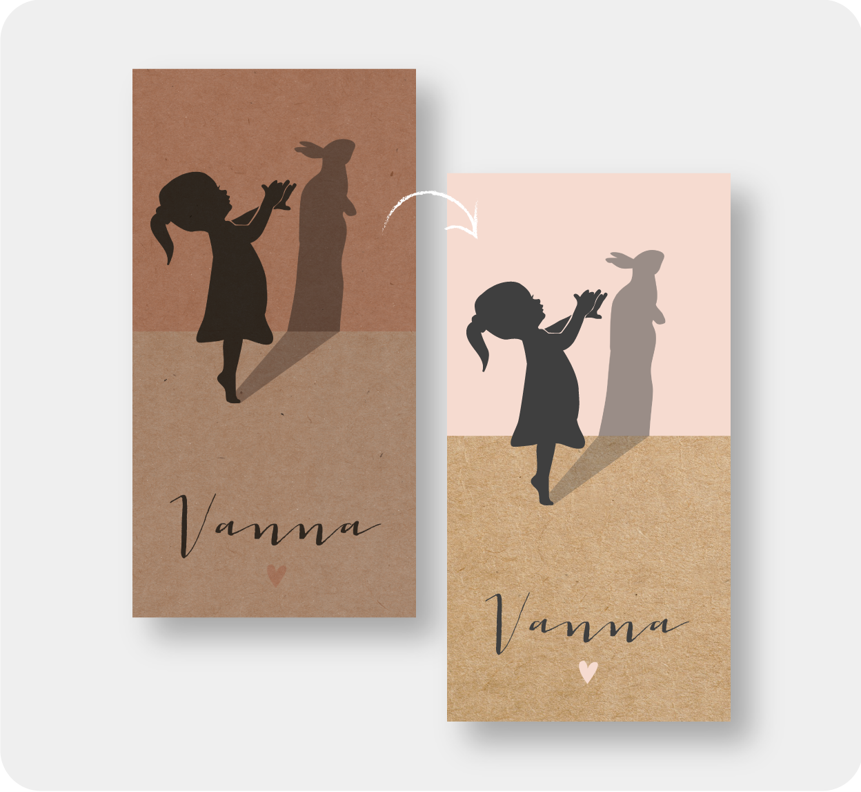 De inkten zijn iets doorzichtig waardoor ze mengen met de ondergrond. Op kraft bruin karton kun je geen pastel tinten gebruiken, dit geeft te weinig contrast en zal niet leesbaar zijn. Wil je toch graag pastel in combinatie met kraft? Dan raden wij je aan het kaartje te bestellen op Wit karton.